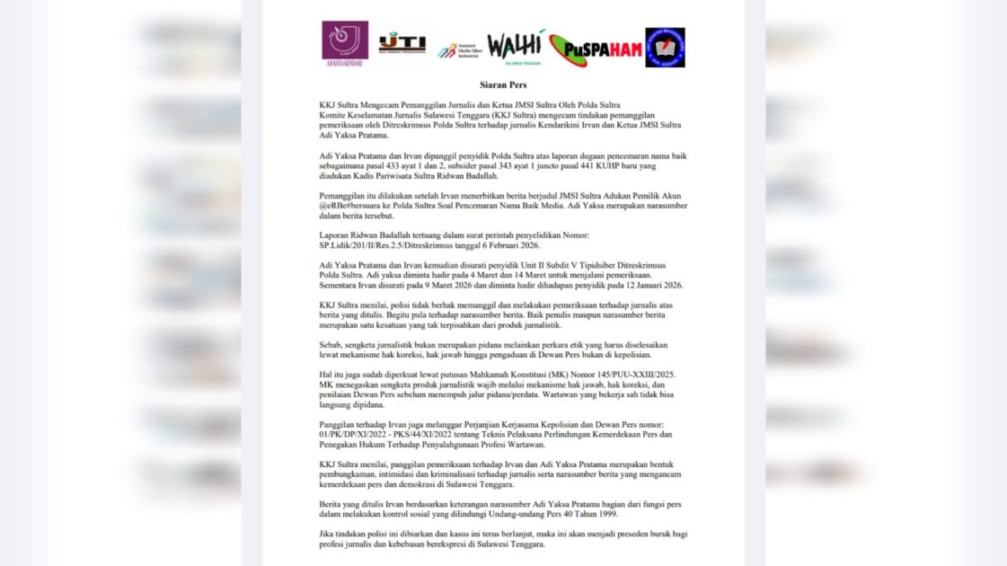 KKJ Sultra menilai langkah pemeriksaan terhadap jurnalis dan narasumber berpotensi mengganggu kemerdekaan pers serta dapat menjadi preseden buruk bagi kebebasan pers di daerah.